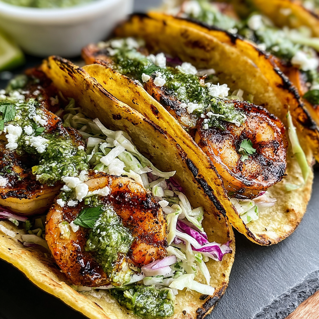 Enjoy the vibrant contrast of grilled shrimp and crunchy slaw, making it a perfect dish for any occasion. With fresh ingredients, exciting flavors, and colorful presentation, these tacos will surely become a favorite at your dining table.